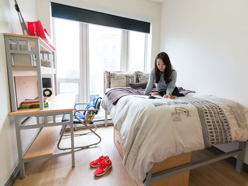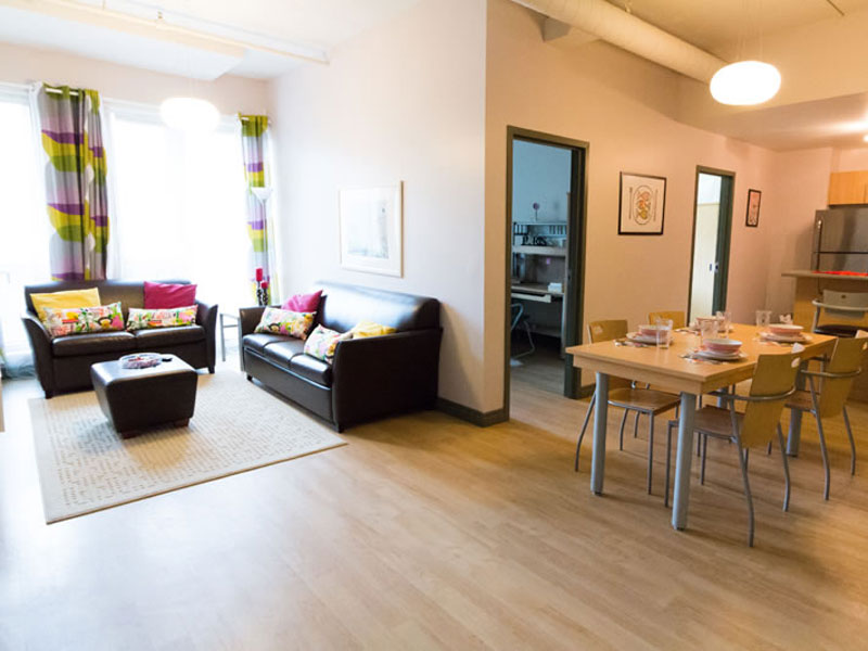 Unterbringung in Apartments zusammen mit 2–4 weiteren Teilnehmern, jeweils im Einzelzimmer. Verpflegung in Eigenregie. Küche, Wohnbereich und Bad werden gemeinsam genutzt. Bettwäsche und Handtücher sind vorhanden. Waschmöglichkeiten stehen gegen Gebühr zur Verfügung. WLAN ist inklusive. Im Gebäude gibt es zudem Gemeinschaftsbereiche, einen Fitnessraum, einen Games Room sowie ein Studierzimmer. Die Sprachschule ist in etwa 15 Minuten zu Fuß erreichbar. Buchbar ab 18 Jahren.
