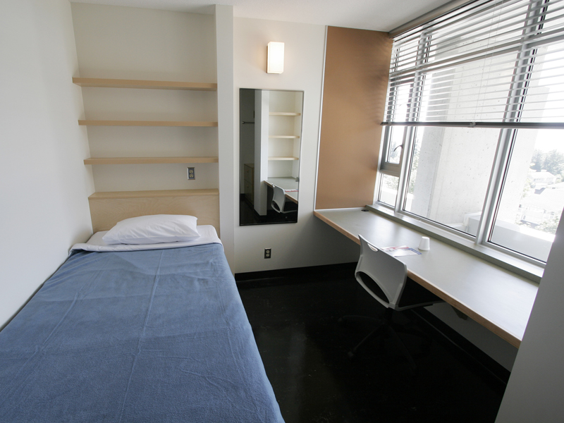 Unterkunft in einem Universitätswohnheim direkt auf dem Campus der Simon Fraser University. Die Unterbringung erfolgt im Einzelzimmer, ausgestattet mit Schreibtisch, Kommode, Kleiderschrank und Mini-Kühlschrank. Auf jeder Etage stehen Gemeinschaftsbäder zur Verfügung. Ein kostenloser Wäscheservice wird wöchentlich angeboten. Bettwäsche wird bereitgestellt und einmal pro Woche gewechselt, Handtücher sind selbst mitzubringen. Besondere Ernährungswünsche wie glutenfreie, laktosefreie oder halal Verpflegung können auf Anfrage berücksichtigt werden.