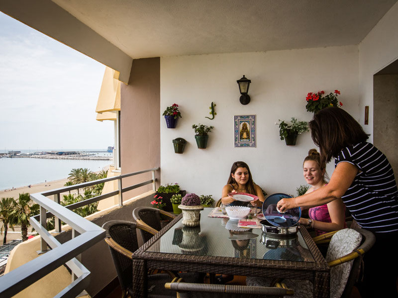Unterbringung in einer lokalen spanischen Gastfamilie. Zur Wahl stehen Einzelzimmer oder – bei gemeinsamer Anreise – Doppelzimmer mit Halbpension. Bettwäsche und Handtücher sind vorhanden, zudem übernehmen die Gastgeber einmal pro Woche das Wäschewaschen. Für Alleinreisende ist die Buchung eines Einzelzimmers verpflichtend. Alle Gastfamilien wohnen in fußläufiger Entfernung zur Schule, ca. 15 bis 30 Gehminuten.