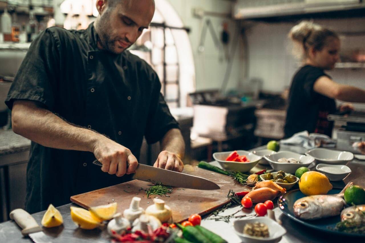 Koch bereitet frische Zutaten in maltesischer Küche zu.