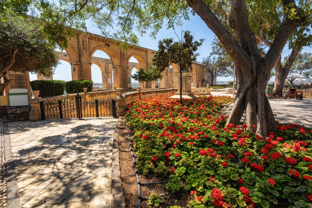 Upper Barrakka Gardens in Valletta mit Blumen und Arkaden.
