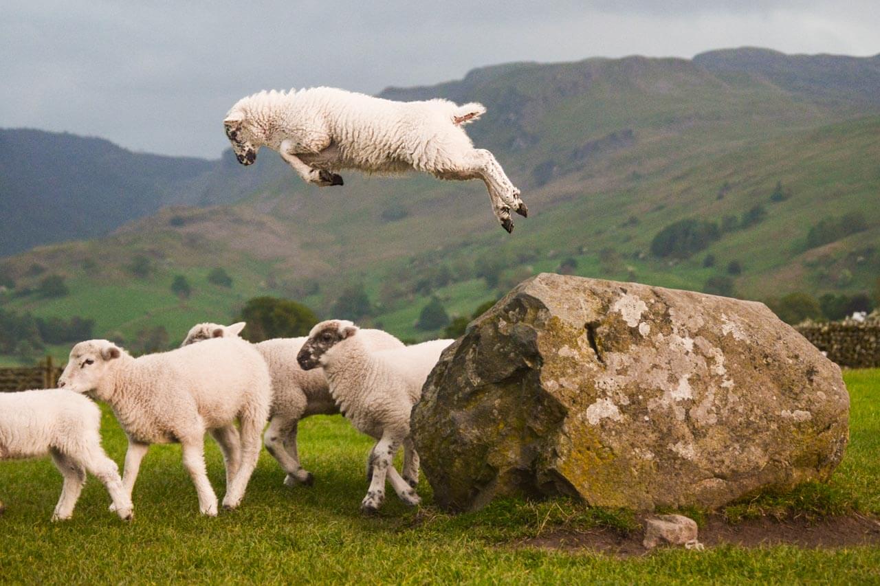 Lamm springt über Fels zu seiner Herde auf grüner Wiese.